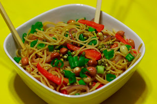 Next, saute the onion, garlic, chili, ginger and bell pepper. Stir fry for 2-3 minutes. When the onion is soft, put in the peanut butter and mix well. Then add the noodles and stir them in.